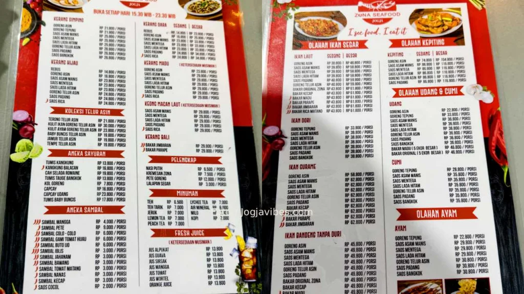 Berbicara mengenai cita rasa masakan, hidangan di Zona Sea Food Gejayan secara keseluruhan tergolong memuaskan. Porsi dan kualitas bahan yang disajikan masih sangat sebanding dengan harga yang ditawarkan. Harga menu di sini bisa dibilang cukup normal untuk kategori warung seafood di area tersebut. Ke depannya, peningkatan kecil pada racikan bumbu tentu bisa menjadi nilai tambah agar pengalaman kuliner pelanggan semakin maksimal.